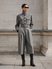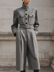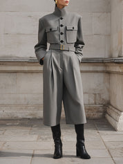 90s Minimalist Stand-up Collar Shoulder Padded Jacket & Loose Capri Pants Set
