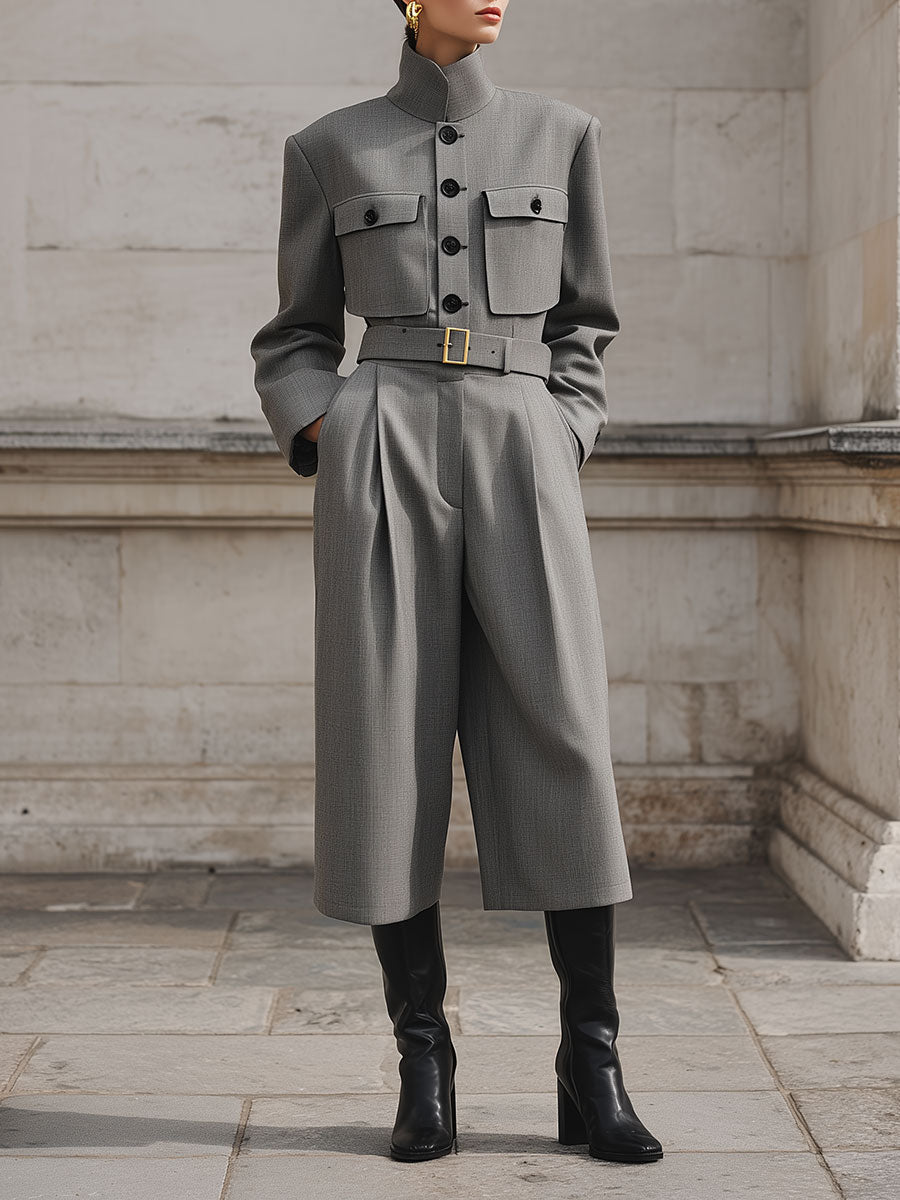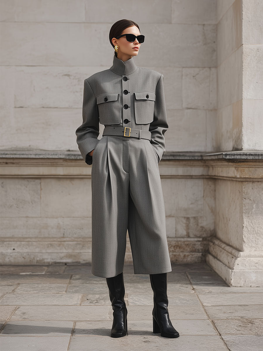 The 90s Minimalist Stand-up Collar Shoulder Padded Jacket & Loose Capri Pants Set is a timeless ensemble that effortlessly combines nostalgia with modern elegance. This set is designed to offer both style and comfort, making it a versatile addition to any wardrobe.