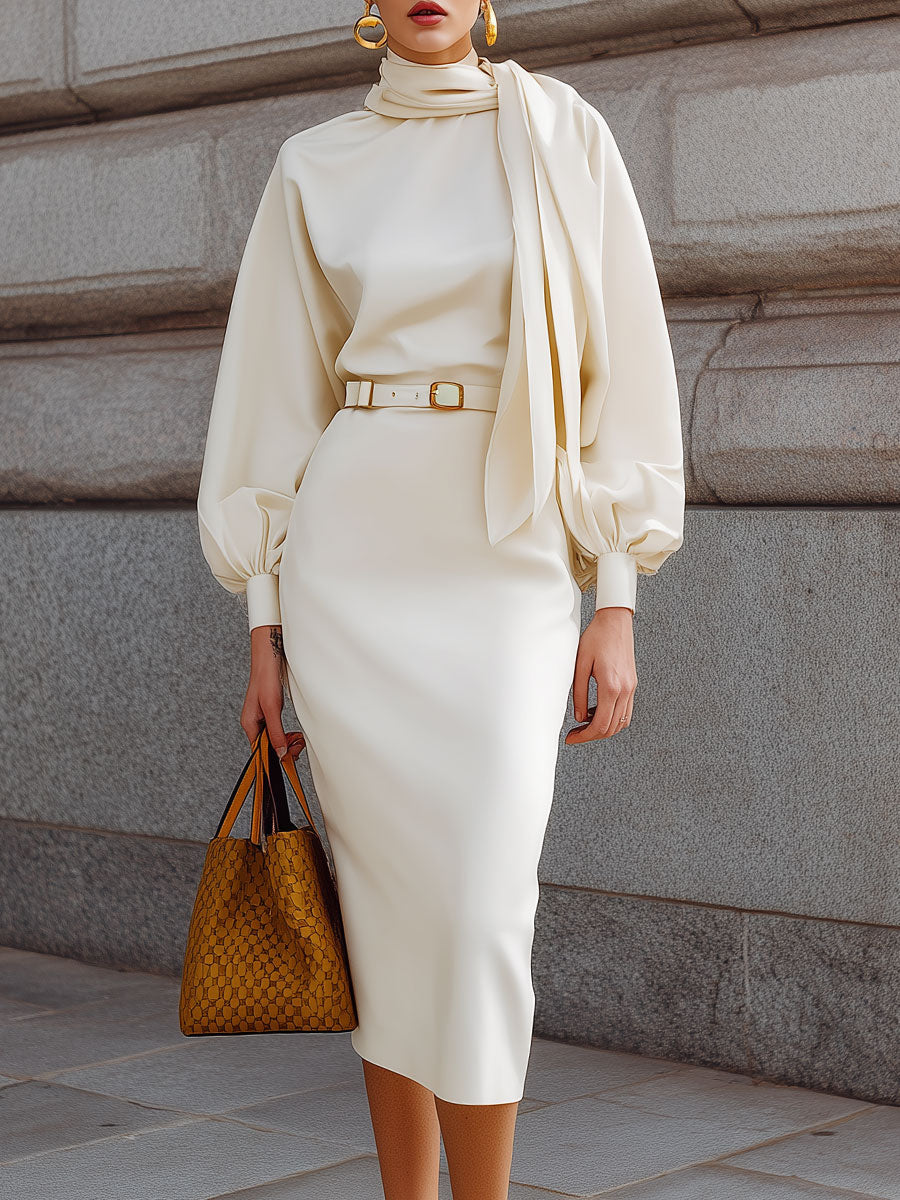 Commuting Lantern Sleeve Neckline Ribbon Midi Dress With Belt