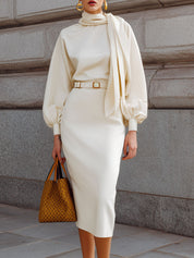 The Commuting Lantern Sleeve Neckline Ribbon Midi Dress With Belt is an elegant and versatile piece that combines classic design with modern flair. This dress is designed to be both comfortable and stylish, making it ideal for both work and casual occasions.