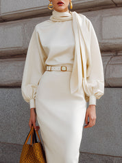 Whether you're heading to the office or a weekend brunch, the Commuting Lantern Sleeve Neckline Ribbon Midi Dress With Belt is a chic and practical choice. Its thoughtful design and added belt make it a versatile addition to your wardrobe.