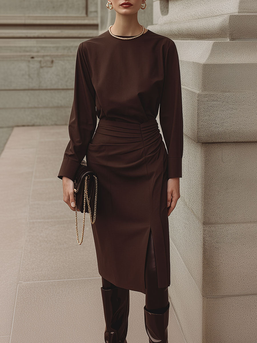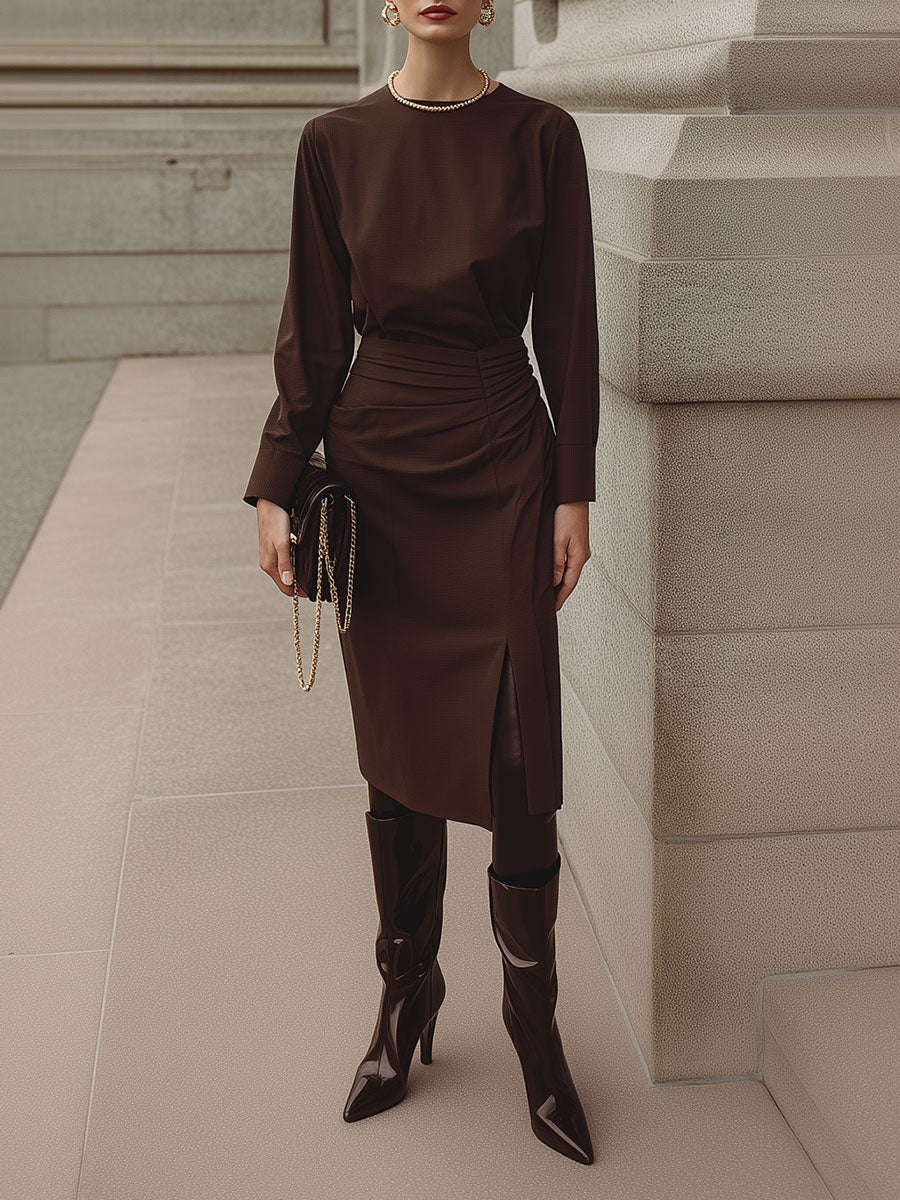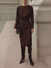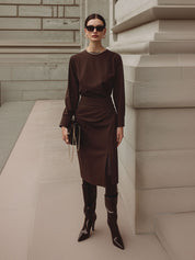 Deconstructed Pleated Waist Midi Dress With Front Slit