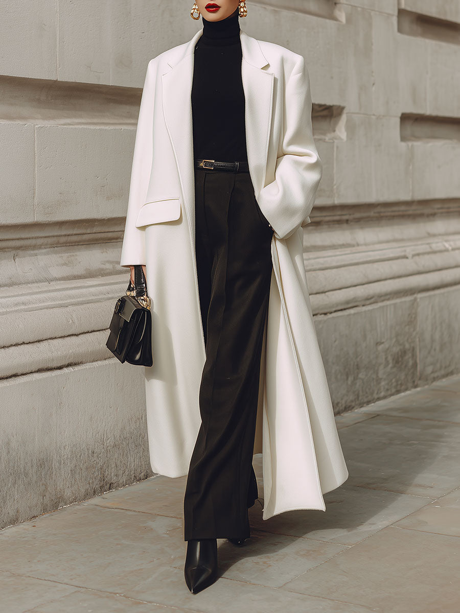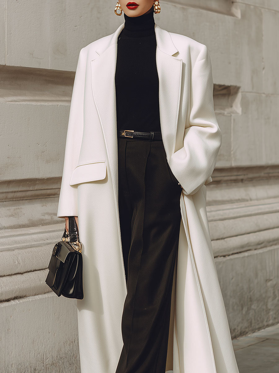 Pair this coat with a simple turtleneck and tailored trousers for a sophisticated office look. For a casual outing, consider styling it with your favorite jeans and ankle boots. Add a scarf in contrasting color to enhance the minimalist design with a pop of color.