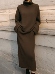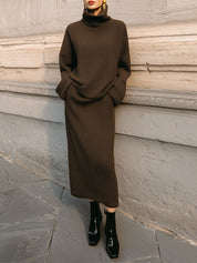 This turtleneck sweater and skirt set is incredibly versatile, making it easy to dress up or down. Pair with ankle boots and a statement necklace for an elegant evening look. For a more casual appearance, combine with sneakers and a crossbody bag. The amalgamation of style and comfort makes it suitable for any occasion.
