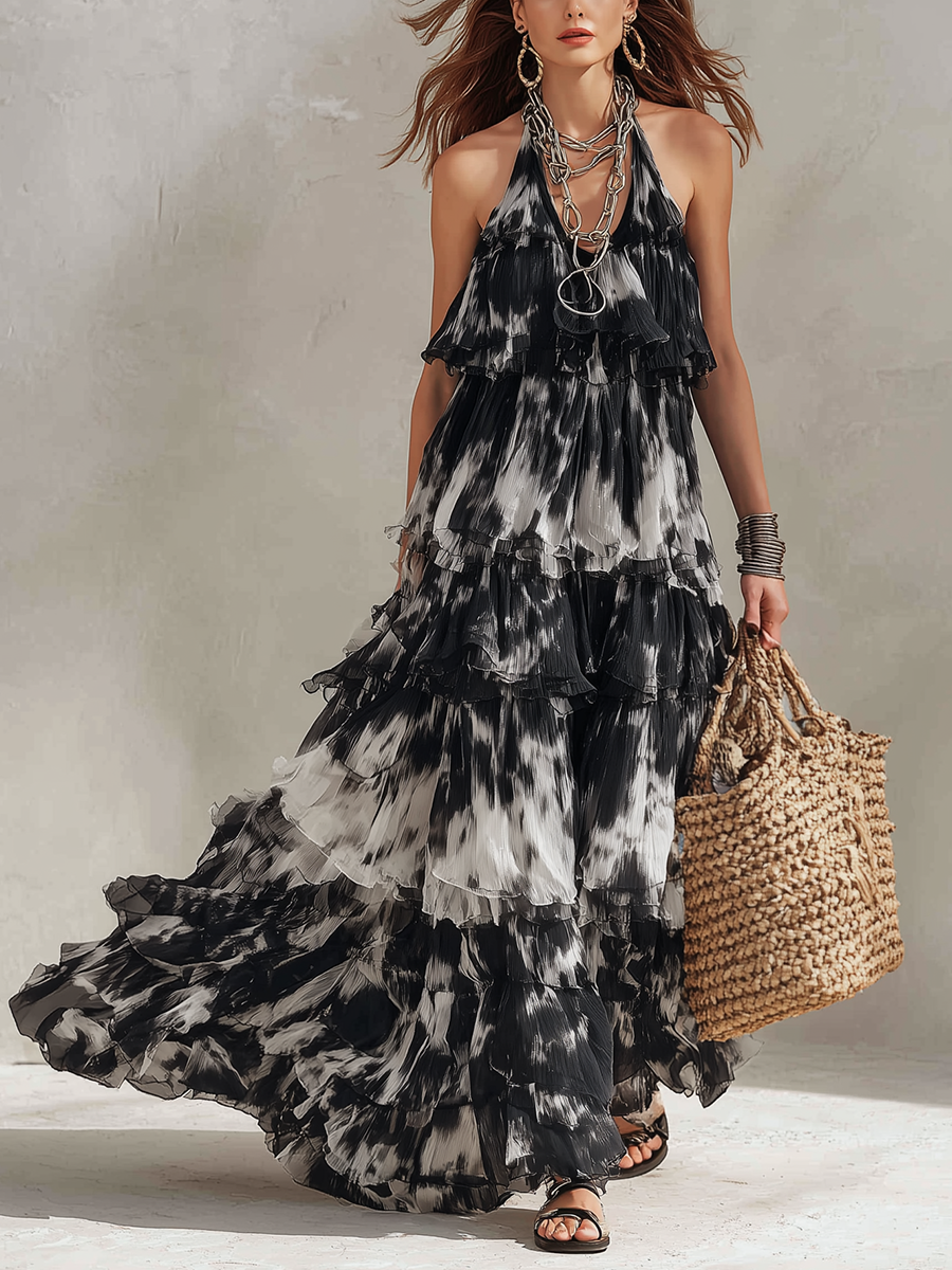 Black and White Tie-dye Halter Neck Layered Ruffle Long Dress