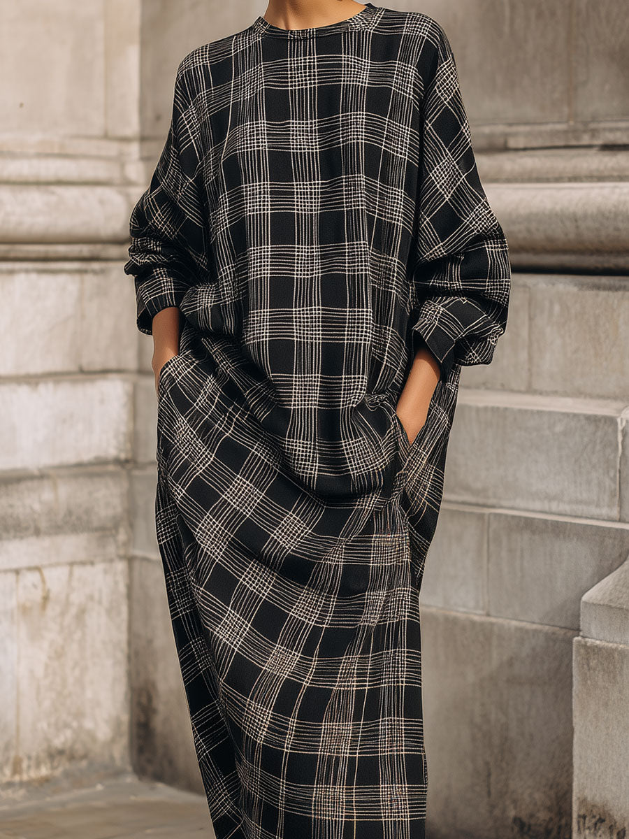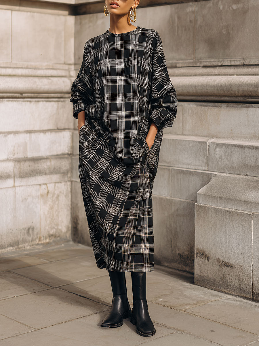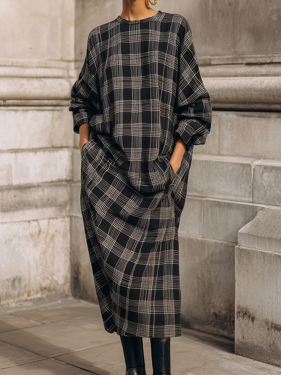 Casual Plaid Oversized Straight Drop Shoulder Midi Dress