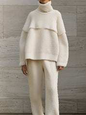 Incorporate the Chic Turtleneck Knitted Off-shoulder Sweater & Micro-flared Trousers Set into your fashion collection for a trendy, versatile addition that seamlessly blends comfort and high fashion.