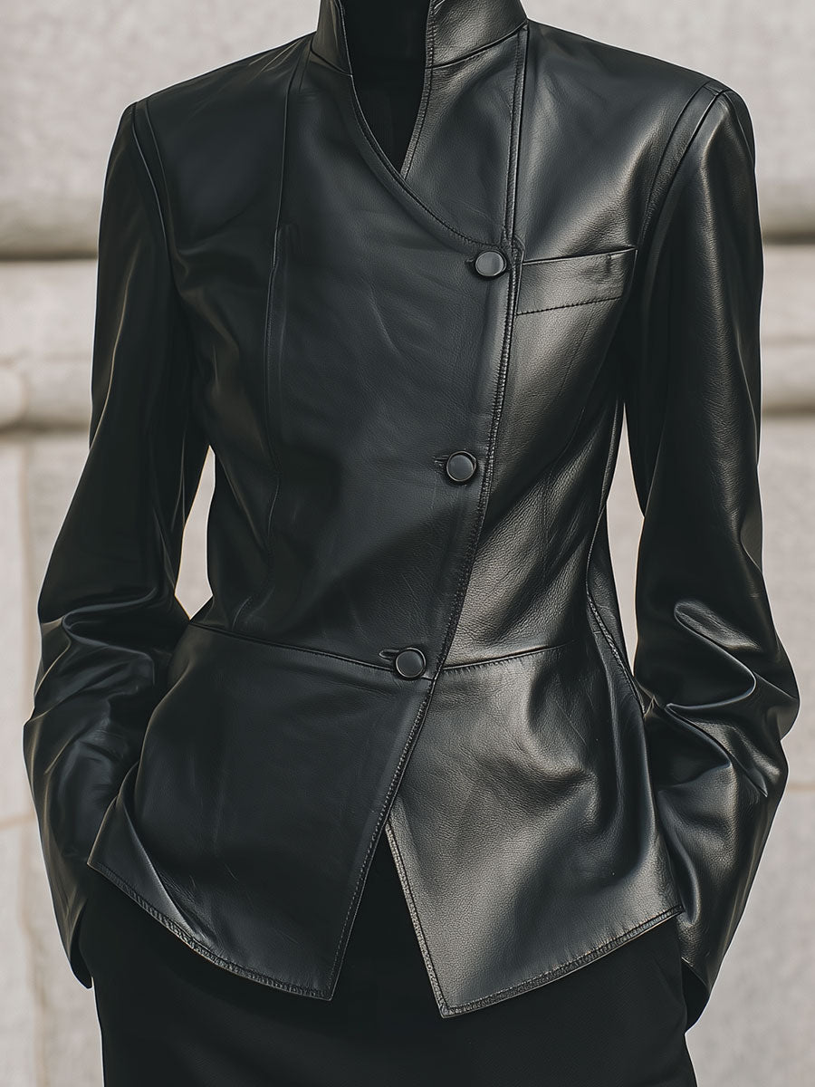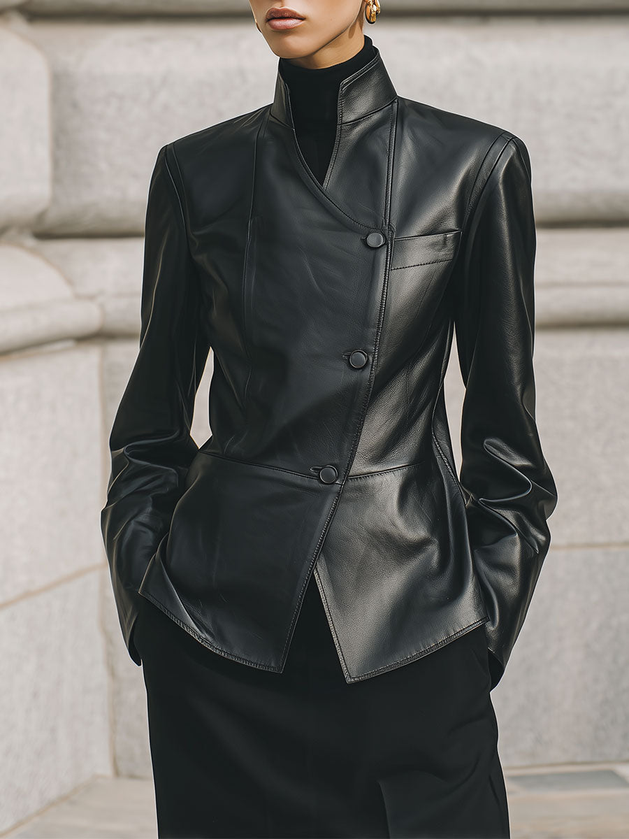 Deconstructed Minimalist Stand Collar Diagonal Placket Eco-friendly Leather Jacket