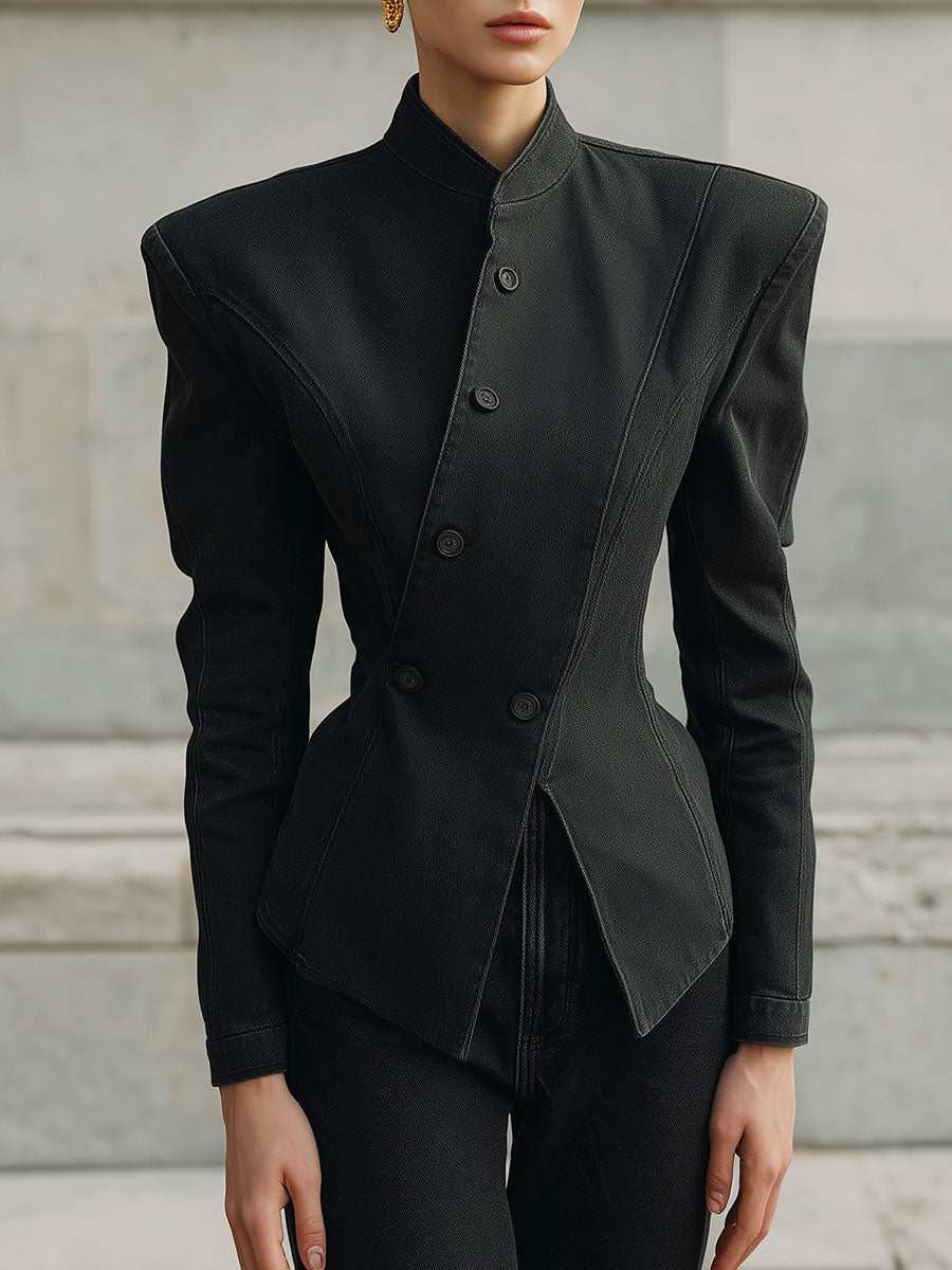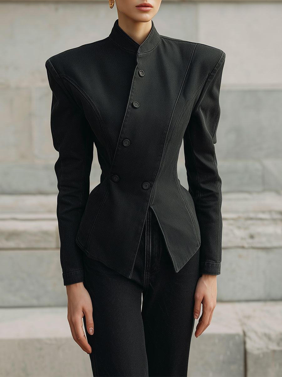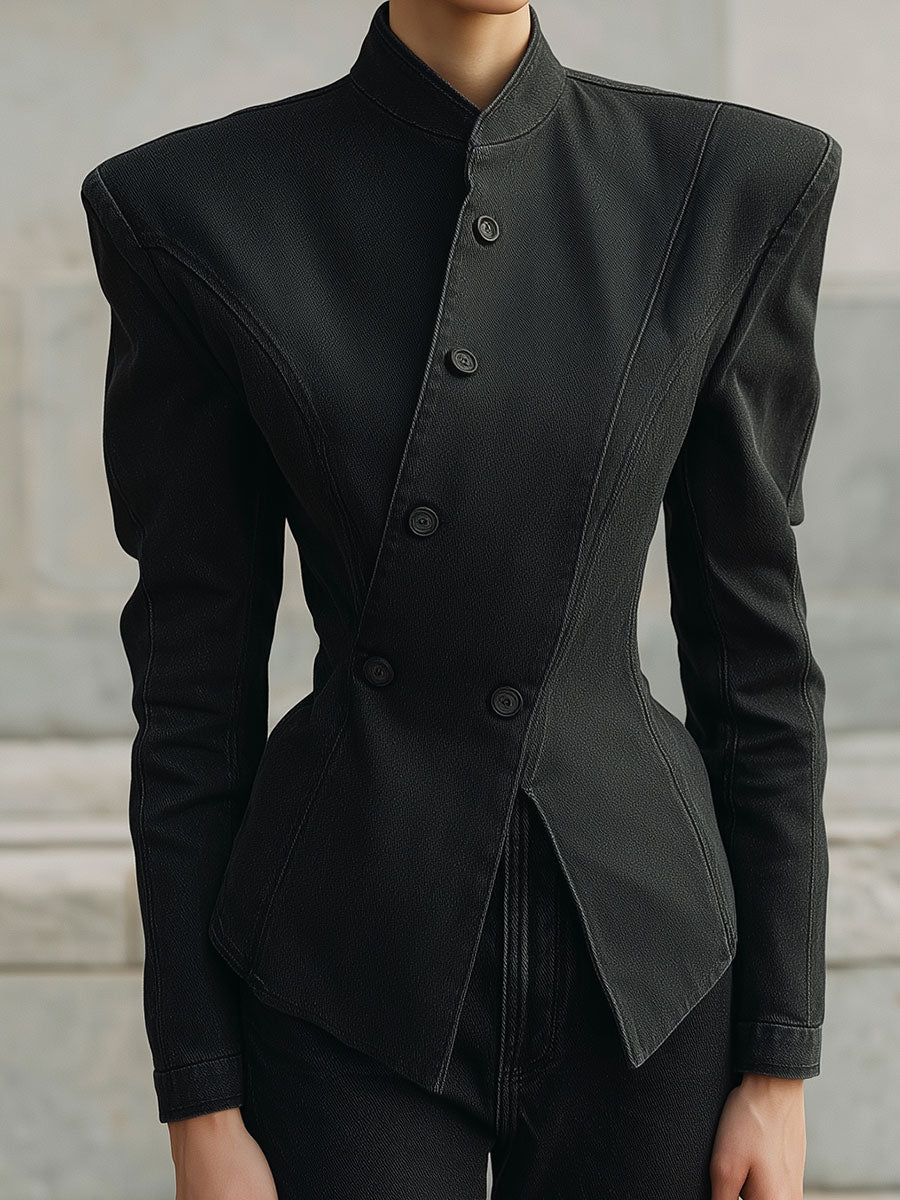 The Deconstructed Washed Denim Stand Collar Diagonal Placket X-fit Waisted Jacket is a versatile and stylish addition to any wardrobe. Its unique design details and flattering fit make it a standout piece, perfect for anyone looking to add a touch of contemporary edge to their fashion collection.