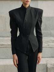 • Design: Stand collar and diagonal placket for a contemporary edge.