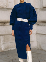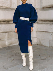 Minimalist Balloon Sleeves Knitted Hem Slit Midi Dress