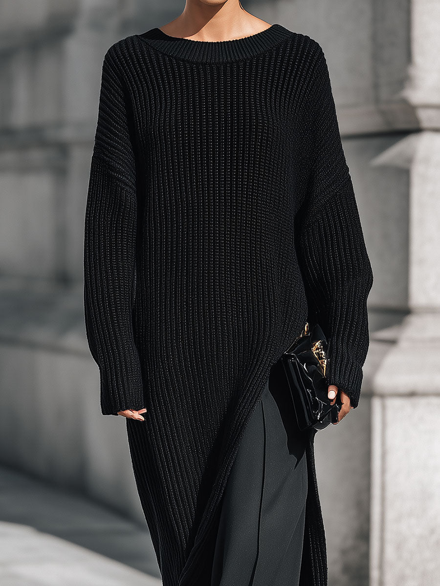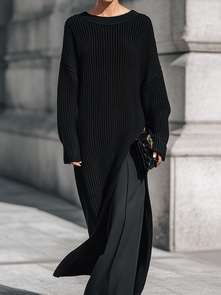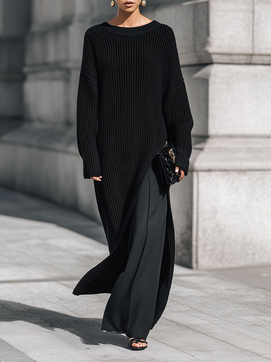 Minimalist Drop-shoulder Knitted Maxi Dress With High Side Slits