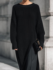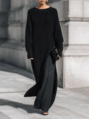The Minimalist Drop-shoulder Knitted Maxi Dress with High Side Slits is an essential addition to any wardrobe. Its blend of comfort, style, and versatility makes it ideal for fashion enthusiasts who appreciate understated elegance.