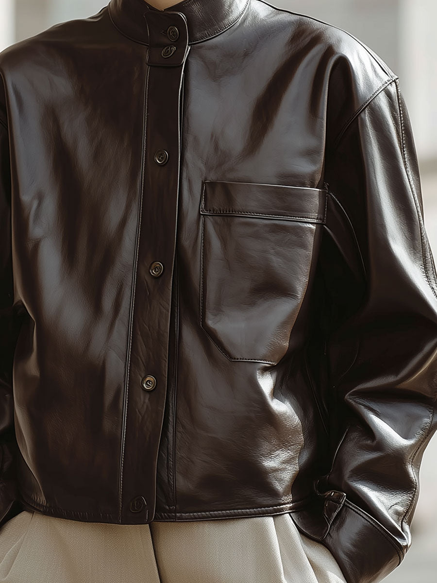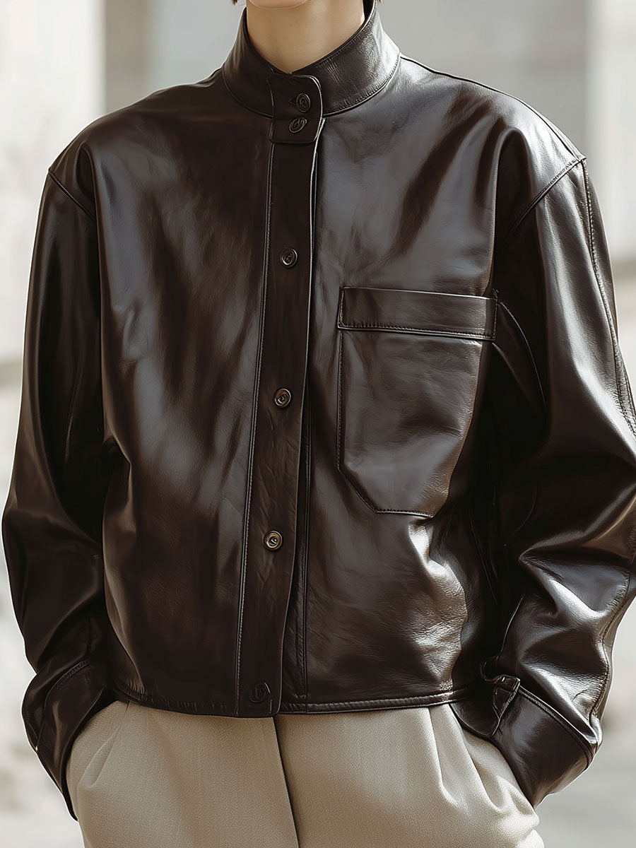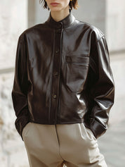 Minimalist Small Stand Collar Environmentally Friendly Leather Patch Pocket Jacket