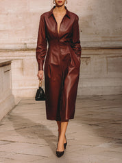 Minimalist Waist Pleated Diagonal Pocket Eco-friendly Leather Midi Dress
