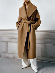 The coat's minimalist design pairs effortlessly with both casual and formal outfits. For a chic and relaxed look, wear over a turtleneck sweater and wide-leg trousers. For a sophisticated appearance, combine it with a tailored dress and ankle boots. Accessorize with a classic scarf or a statement handbag for added elegance.