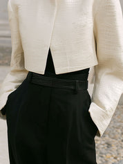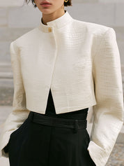This short jacket pairs well with a myriad of outfits. For a chic and polished look, combine it with high-waisted trousers and a crisp white shirt. For a more casual vibe, wear it over a fitted tee and jeans, complemented with ankle boots or sneakers. Accessorize with simple gold jewelry to accentuate its luxurious appeal.