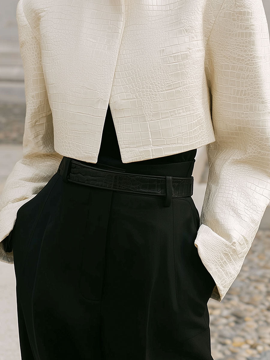 In essence, the Old Money Crocodile Pattern Environmentally Friendly Leather Short Jacket is a statement piece that merges fashion-forward thinking with a sustainable ethos. It is an essential addition to any wardrobe that values both style and ecological consciousness.