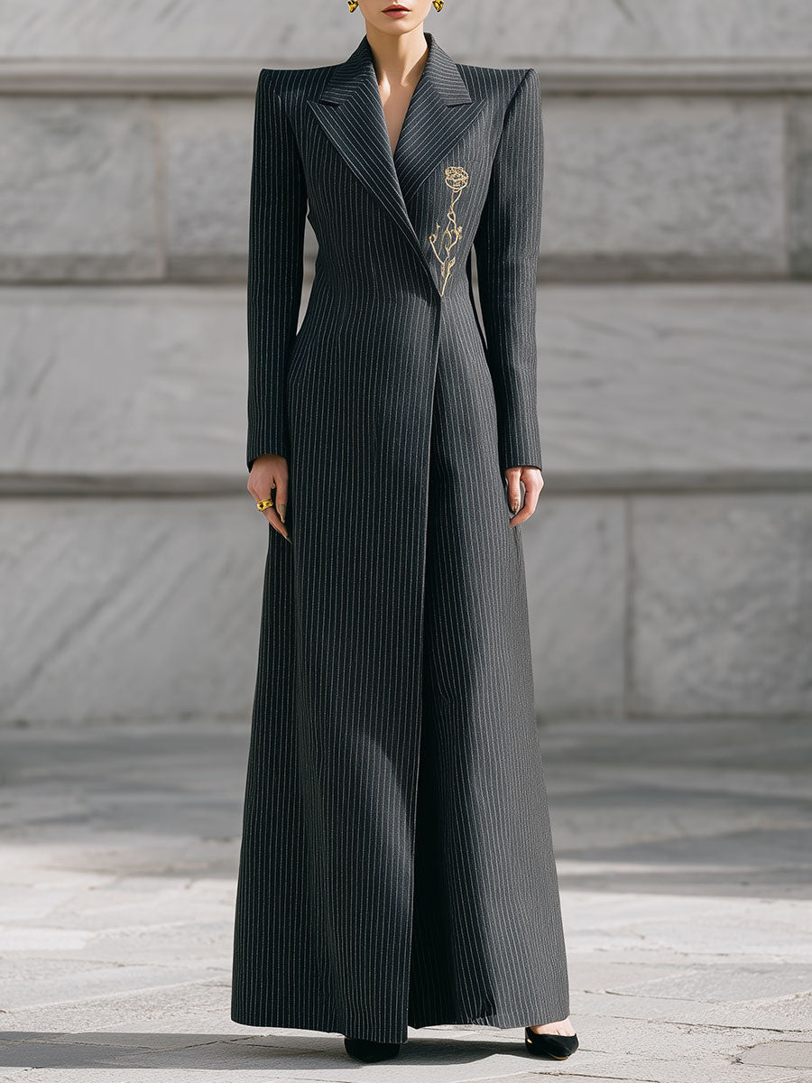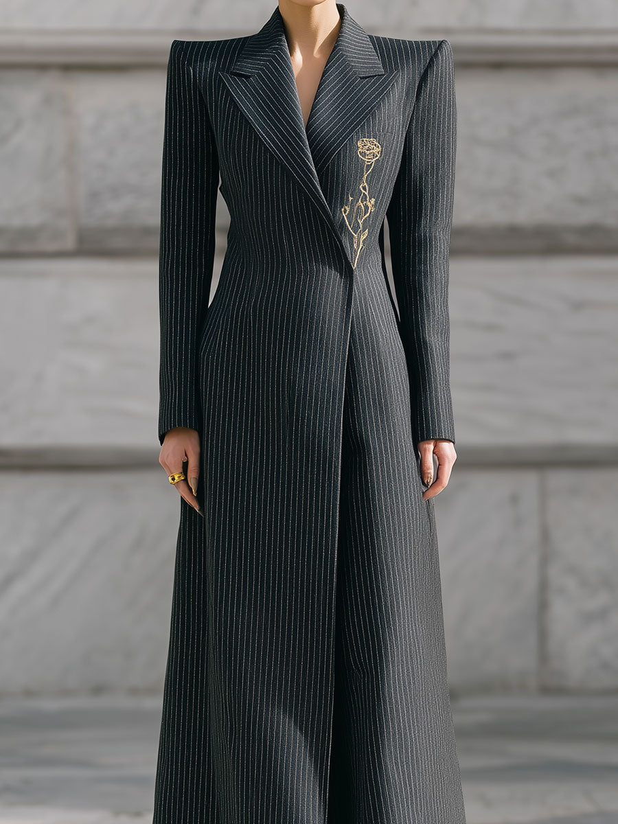 Introducing the exquisite "Old Money Style Striped Rose Embroidered Long Coat" - a seamless blend of classic sophistication and modern elegance. This enchanting coat features a timeless striped pattern, enhanced by delicate rose embroidery, making it a perfect statement piece for any wardrobe.