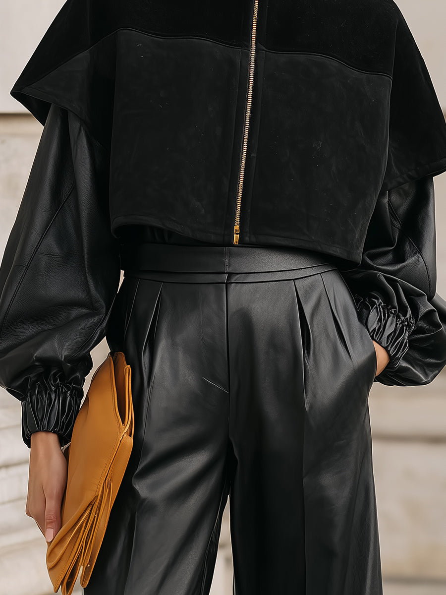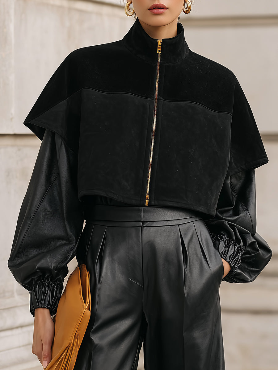 Old Money Suede & Eco-leather Spliced stand Collar Cape Sleeve Jacket